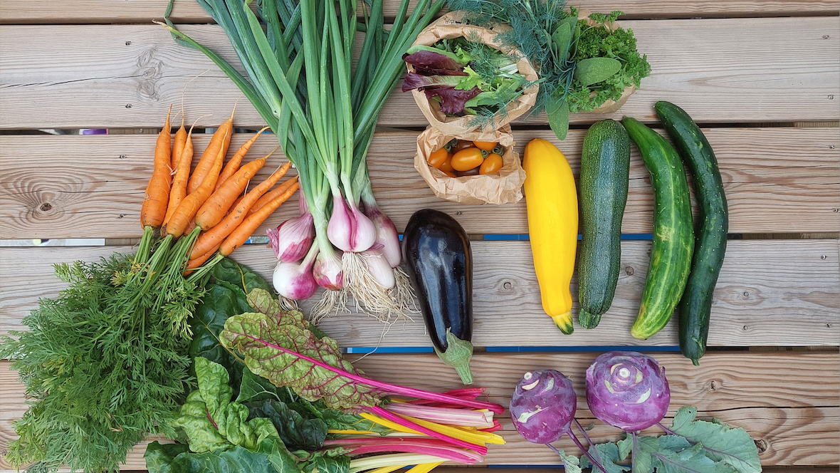 Au menu, en fonction des saisons : salades, jeunes pousses, oignons, ail, carottes botte, concombre, tomates, poivrons, aubergines, choux, radis, petits pois, haricots, maïs doux, betteraves, bettes, herbes aromatiques, courges et potirons, courgettes, épinard – et certaines choses plus atypiques ou des variétés que vous découvrirez au fil des mois (physalis, piments doux, variétés anciennes, …).
