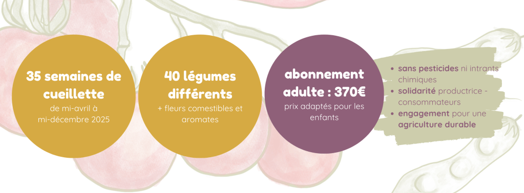 Je vous propose en 2025 un prix de lancement, avec cueillette entre mi-avril et mi-décembre*, soit 35 semaines de cueillette. Pour découvrir le potager, ce que vous y trouverez et le concept de l’auto-cueillette, c’est par ici.